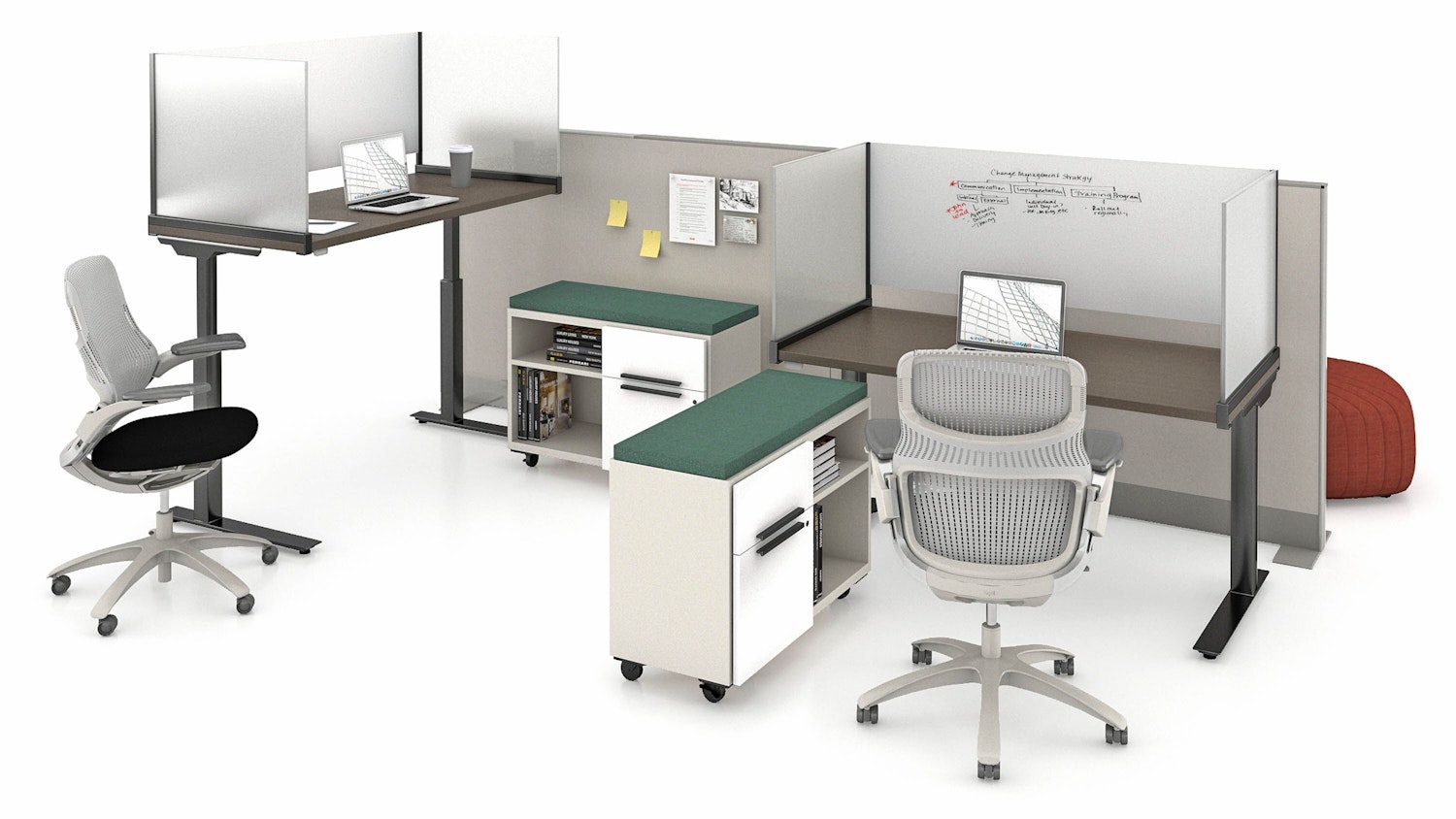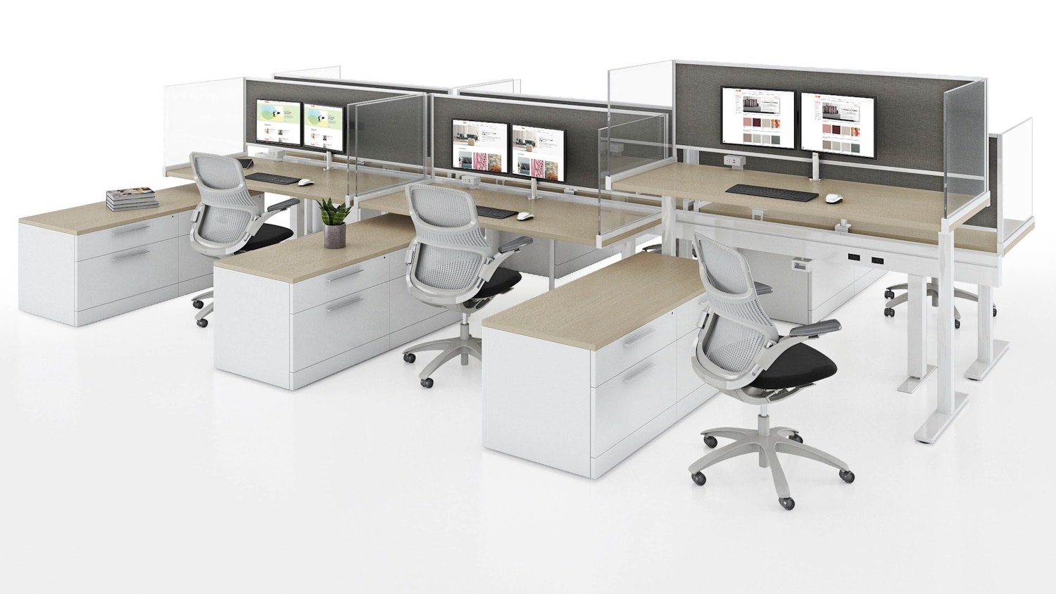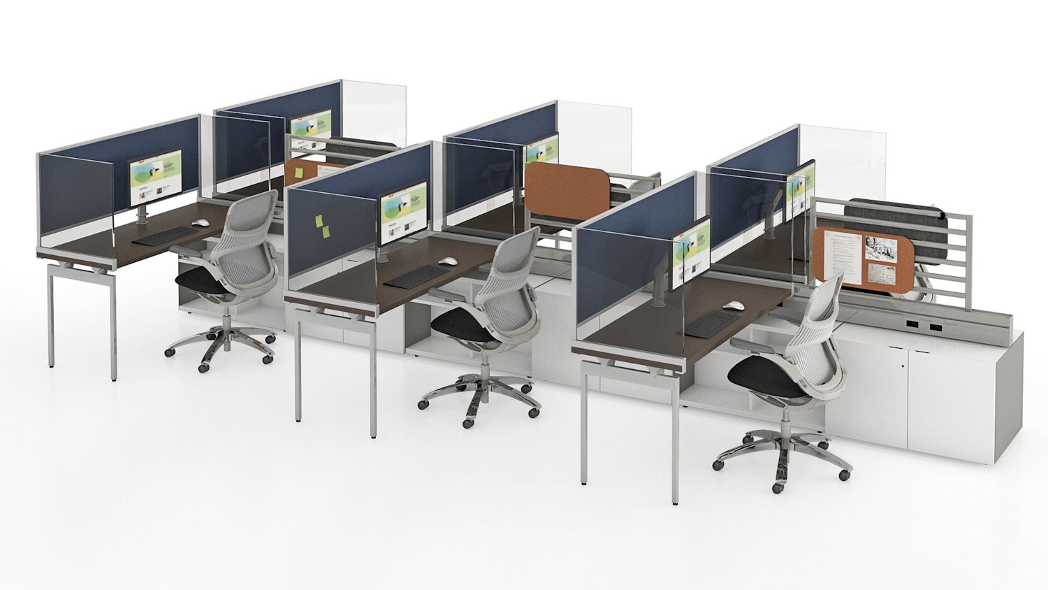 End and Intermediate Screens plan at the end of a desk or are shared between adjacent users to delineate individual workspaces. End Screens feature a bracket that clamps to the front and back edges of the top for easy removal or reconfiguration.