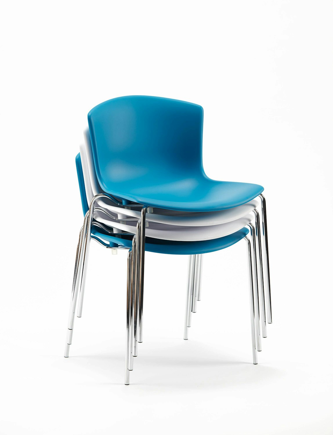 The Bertoia Molded Shell Stacking Side Chair is a modern adaptation of the shell chair originally debuted in 1960. The new stacking base offers new opportunities and expanded applications for the classic design. The chairs stack five high on the floor.