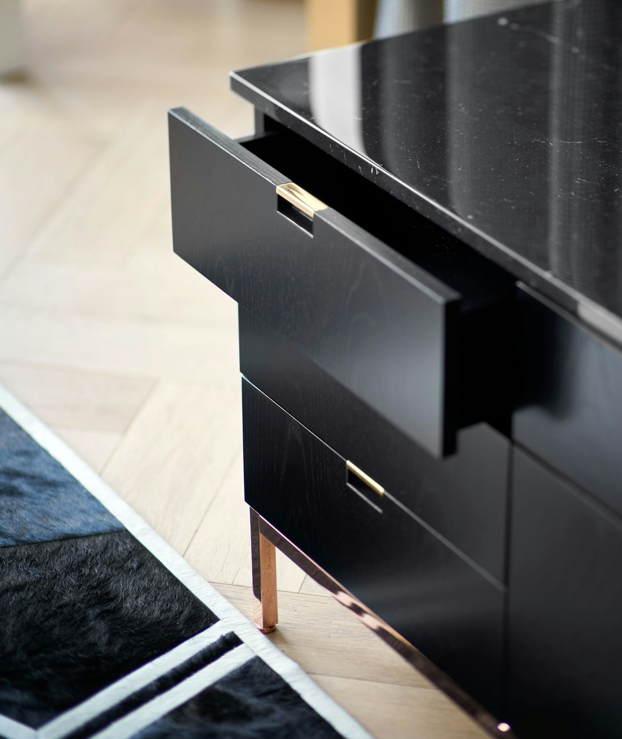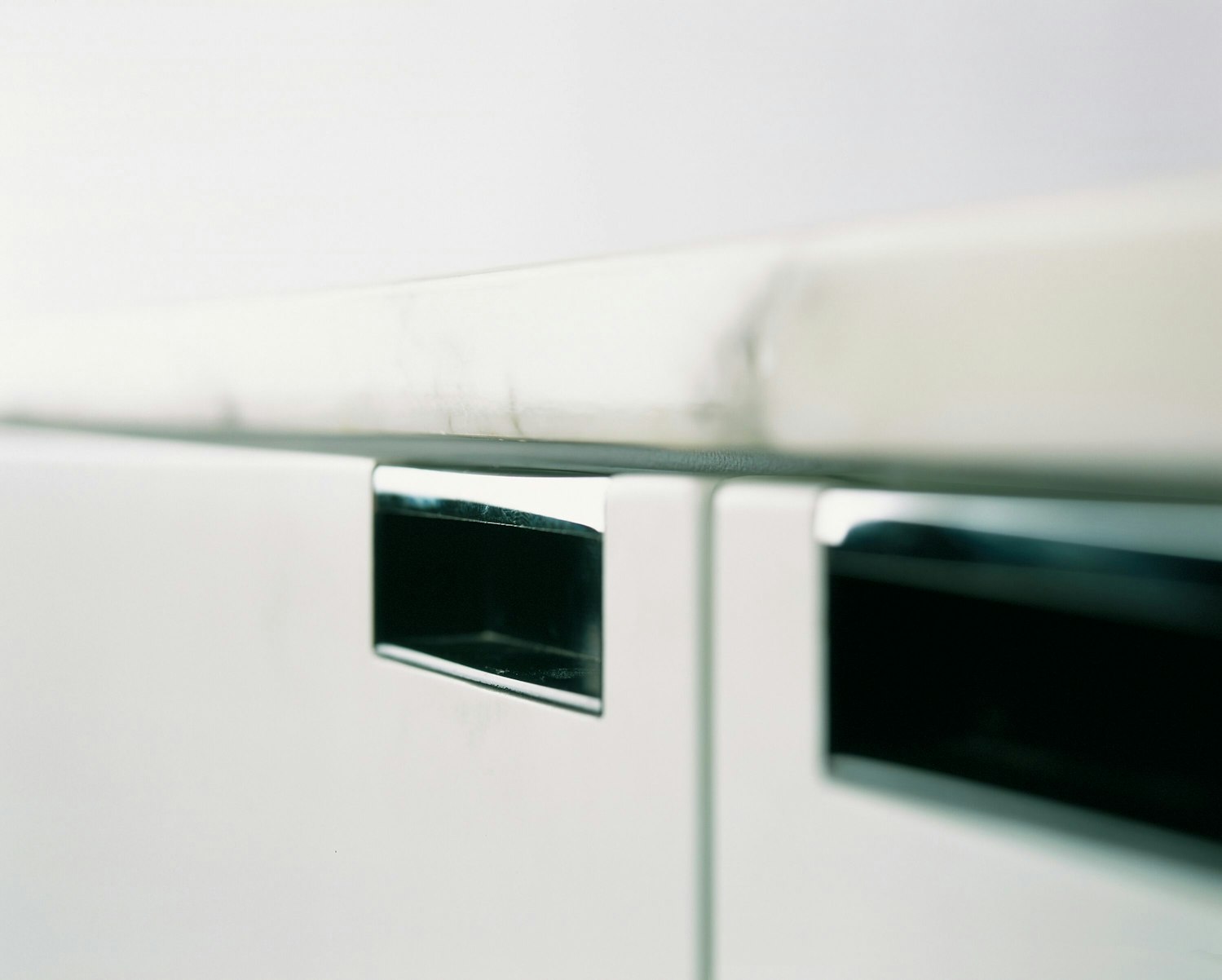 Drawer and door fronts in same wood veneers or lacquer finish as body. All have polished aluminum pulls, top flush mounted storage doors with magnetic closures. Drawer and storage have matching veneer inside. NOTE: Only 2544M and 2545M are available with white laquer finish.