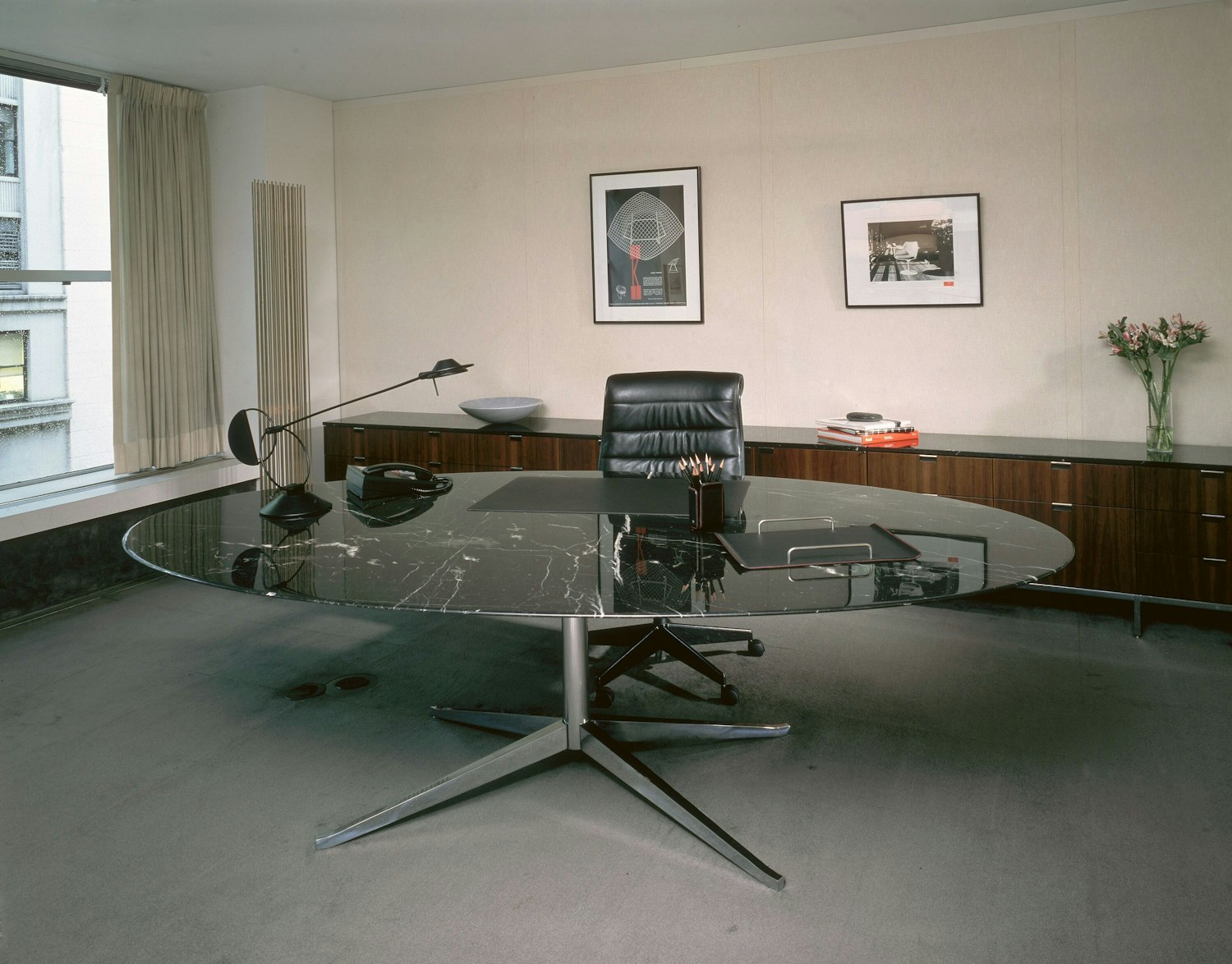 Seeking to create a space better suited to the executive’s primary function — communication — Florence reconsidered the layout from an architectural perspective. She replaced an imposing, diagonal desk with the more inviting table desk, placed parallel to the back wall. Storage was moved to behind the table in a low, matching credenza.