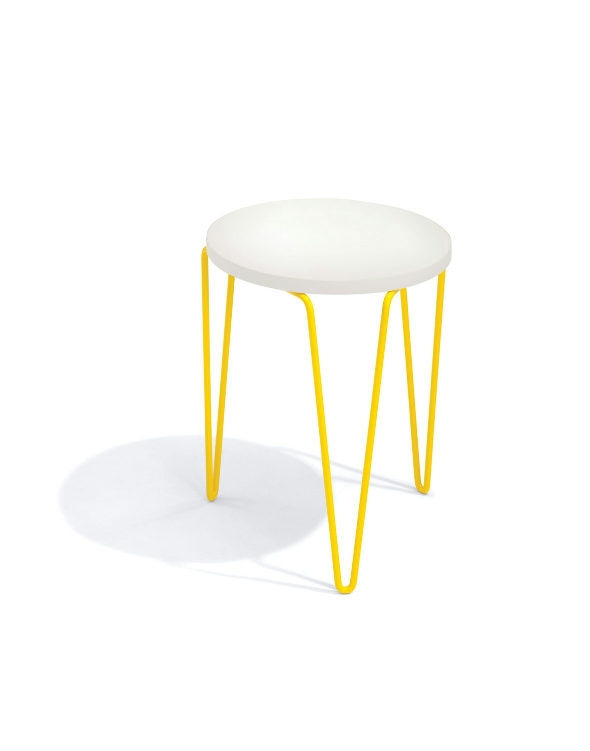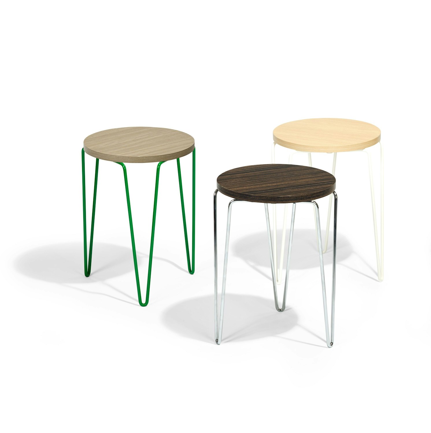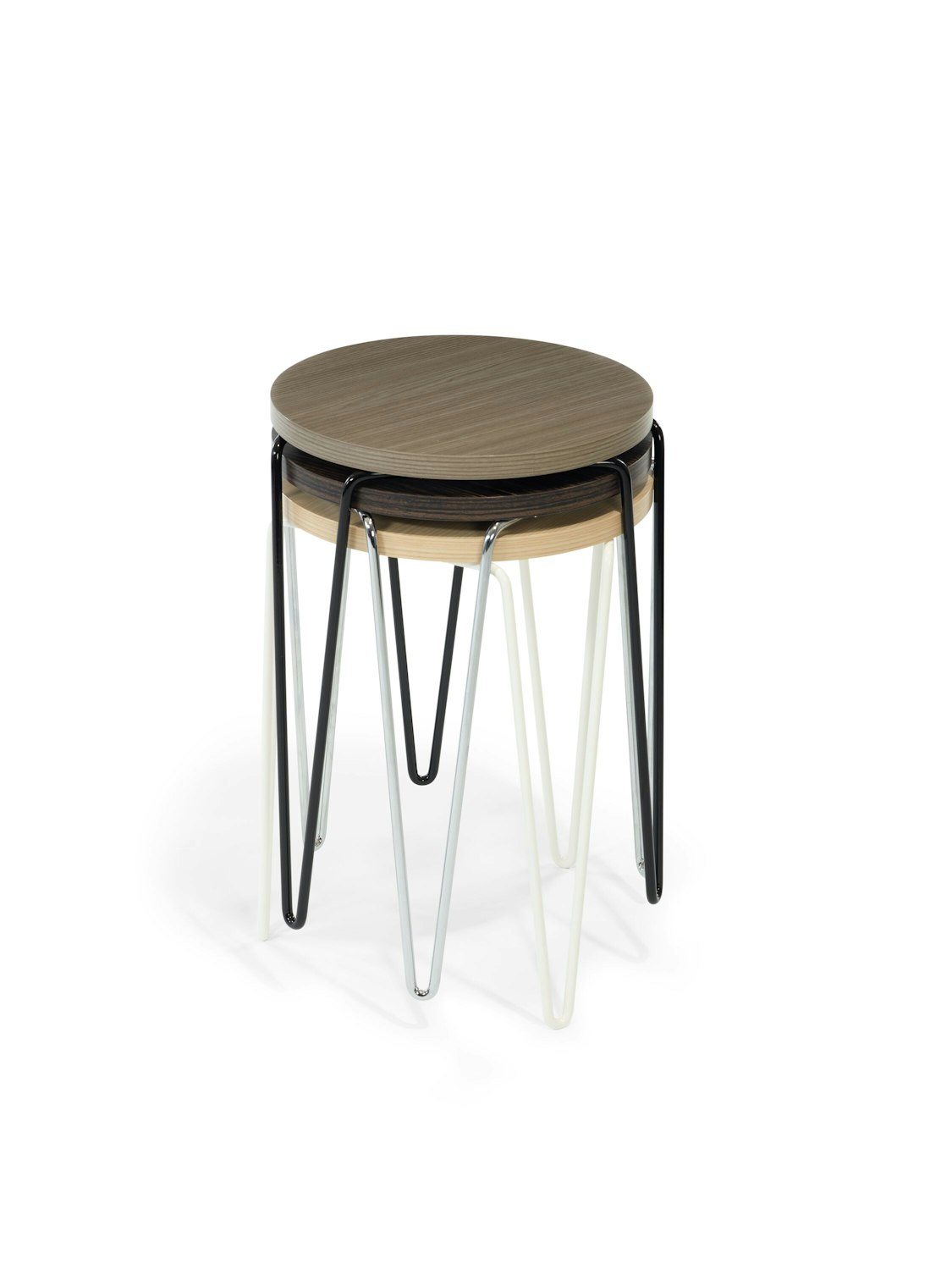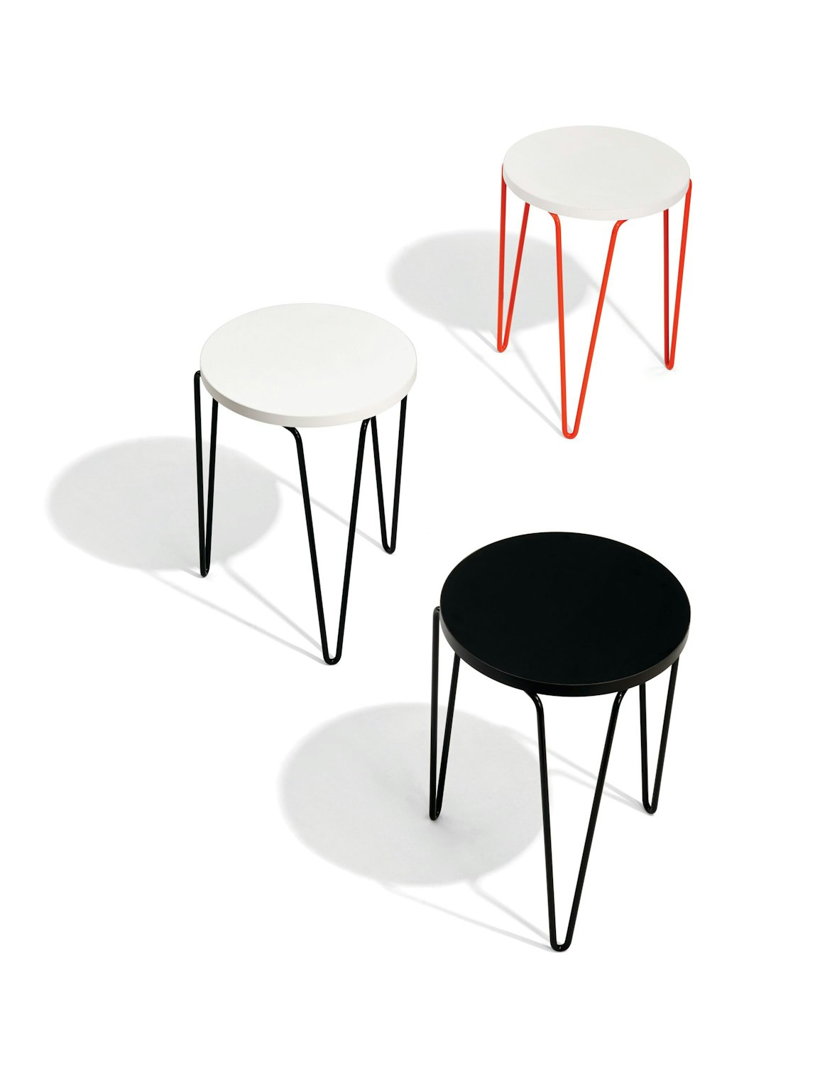 The design remained in production until 1966 and was only briefly reproduced in 1981 for the Innovative Furniture in America exhibition at the Cooper Hewitt Museum in New York. The Model 75 stool is now reintroduced as the Hairpin™ Stacking Table, which is made of a painted steel base and a laminate top, and can stack up to five tables. The table is an affordable piece of timeless design that adds an eclectic, whimsical element to any space.