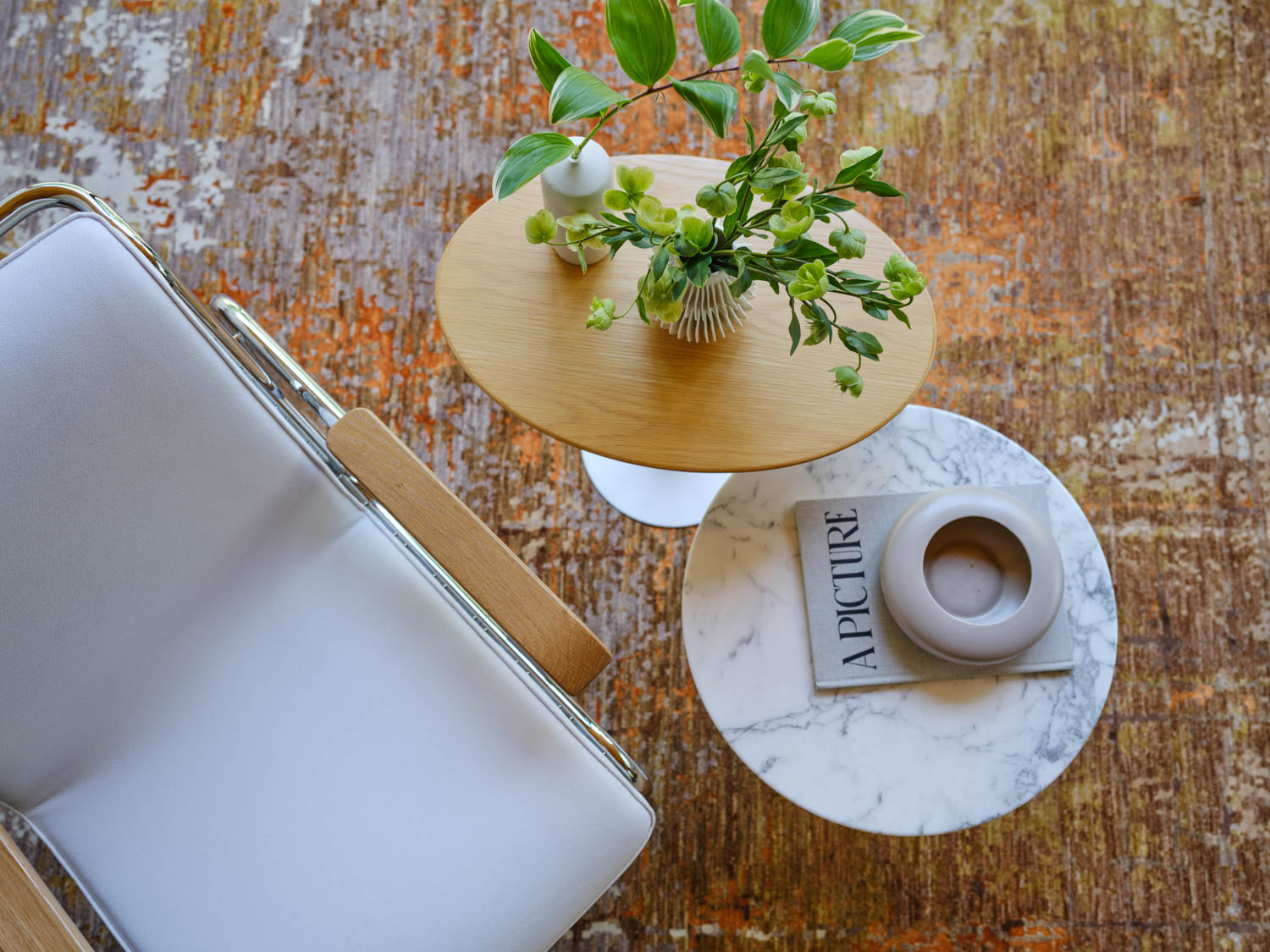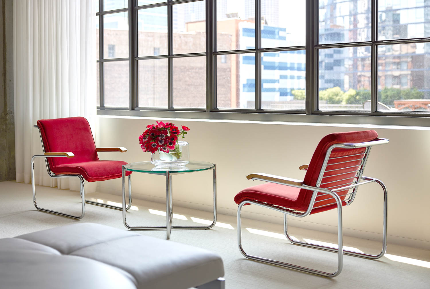 Marcel Breuer 1929 MB Lounge is part of the architect’s extensive work using tubular steel, a revolutionary material in furniture construction at the time. In a contrast to the Wassily Chair—one of Breuer’s best-known designs from the Bauhaus—the MB Lounge features a seemingly continuous, freefloating frame, simultaneously reflecting a tensile strength and straightforward elegance. The chair combines an upholstered foam cushion supported by horizontal metal springs that provide slight movement to the back, along with natural oak armrests that have a clear lacquer finish.