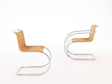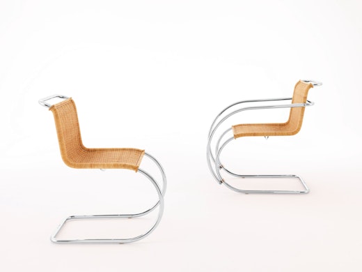 The origins of the bent-steel cantilevered chair are somewhat murky, but generally three names come up in the discussion. Marcel Breuer is widely credited with pioneering the exploration of the material, Mart Stam seems to be the first to conceive a “chair without back legs”, and Mies van der Rohe is remembered as the one who made it beautiful.