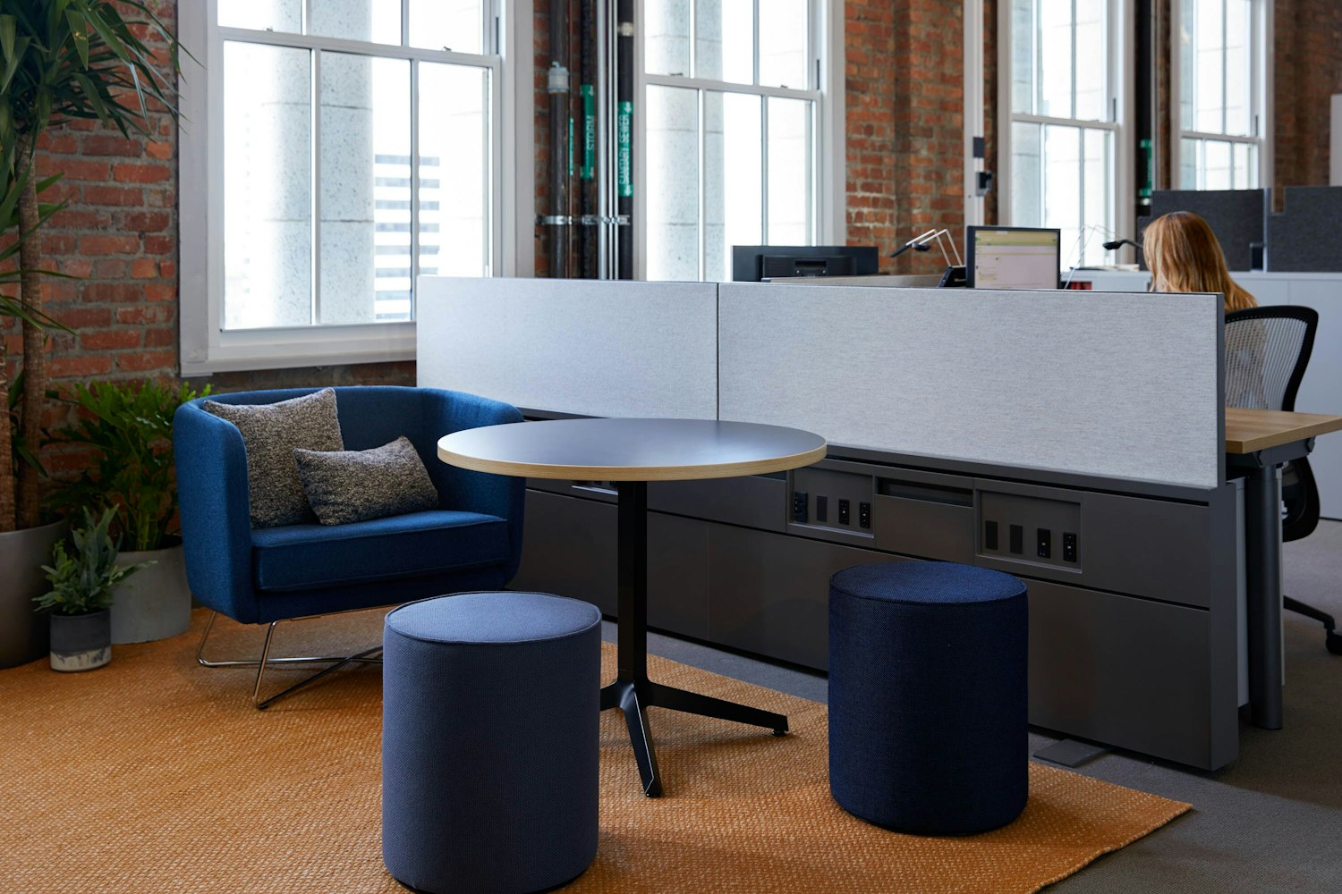 15053 | Rockwell Unscripted Club Chair and Upholstered Seat with Dividends Skyline X Base Table and Antenna Fence