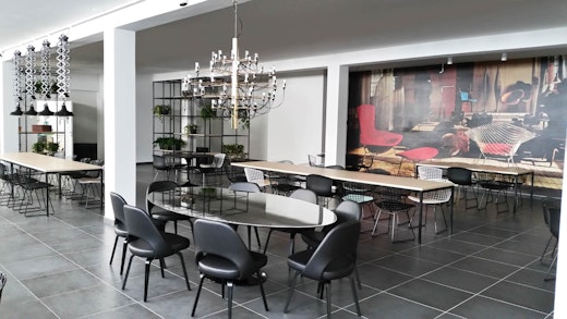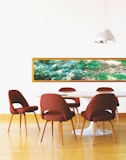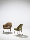 After winning the Museum of Modern Art Organic Design Competition with Charles Eames for their experiments with bent plywood in 1941, Eero Saarinen was eager to continue exploring the possibilities of a chair that achieved comfort through the shape of its shell, not the depth of its cushioning. Initially, he began the investigation with designs for smaller fiberglass task chairs, but changed direction when Florence Knoll approached him and asked, “Why not take the bull by the horns and do the big one first? I want a chair that is like a basket full of pillows…something I can curl up in.” While that’s not exactly where Saarinen ended up, the suggestion inspired one of the most iconic, and comfortable, chairs of the modern furniture movement, The Womb Chair.