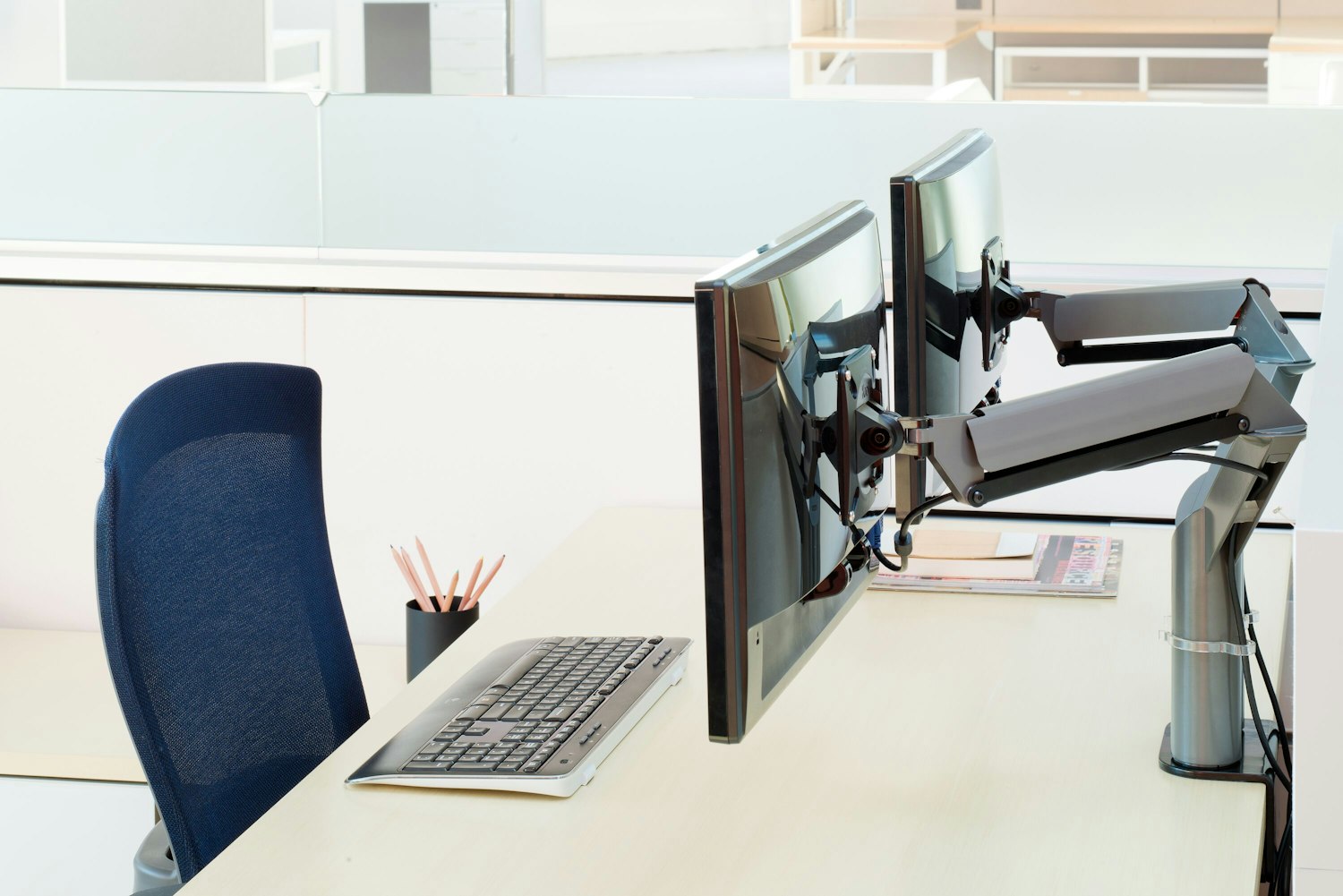 Dual Sapper XYZ offers fluid, independent movement for two monitors mounted to a shared clamp. The inventive design features one-touch adjustability especially critical to the high performance workplace.
