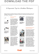 The ten tips above are basic guidelines to help ensure that the work environment is comfortable and supportive for employees. For additional information and specifics on what elements should be considered when developing a standard for a primary workspace, refer to the Knoll research paper ‘Office Ergonomic Standards: A Layperson's Guide.' This paper can help you better understand how to interpret and apply ergonomic standards and guidelines in your own workplace.