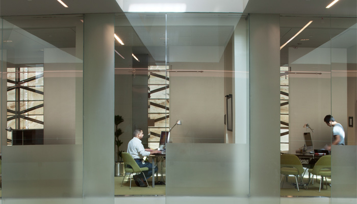 “Though private office specs called for a wall applied support structure, we educated the client that freestanding walls would be a much easier and economical solution.”