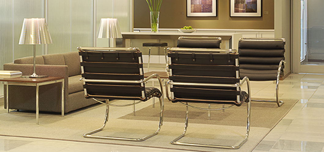 In the main reception area, Lewis, Rice & Fingersh selected iconic Florence Knoll and Barcelona® Lounge Collection furniture. MR seating and Four Seasons Barstools by Mies van der Rohe, distinguished by their cantilevered chrome frames and meticulous craftsmanship, create an elegant focal point in the firm's lounge area.