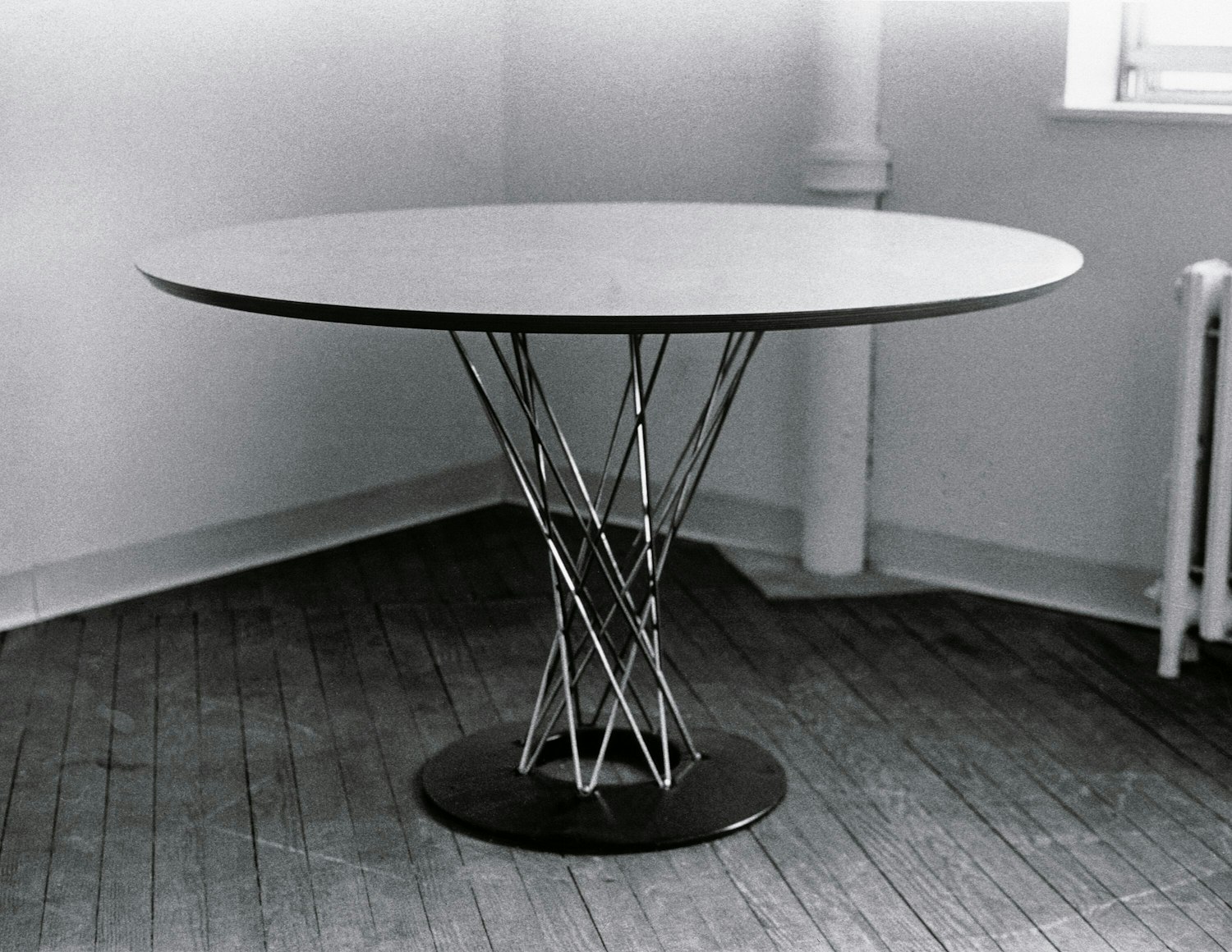 Initially conceived as a rocking stool, Isamu Noguchi's playful design caught the attention of Hans Knoll who thought it a perfect complement to the Bertoia wire collection. At the suggestion of Hans Knoll, Noguchi adapted the stool into a small table in 1954, and a full size dining table in 1957. The distinctive base features chrome-plated steel wires set into a cast-iron, black porcelain-finished foot. The top is available in white or black laminate.